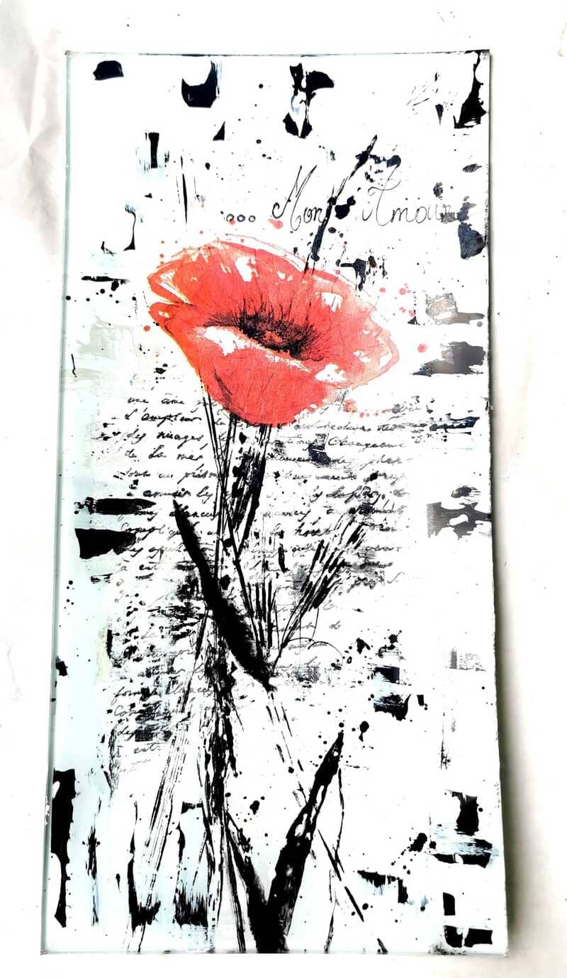 Thème « Fleurs » + 1h30 de vidéo pour réaliser ce modèle et apprendre le collage sur verre, la superposition, la protection des couleurs, le travail de la profondeur par l’application de la peinture en couche successive, la décoration avec du feuillage naturel . Balade dans la campagne.